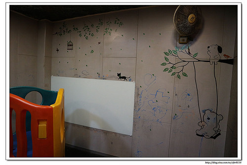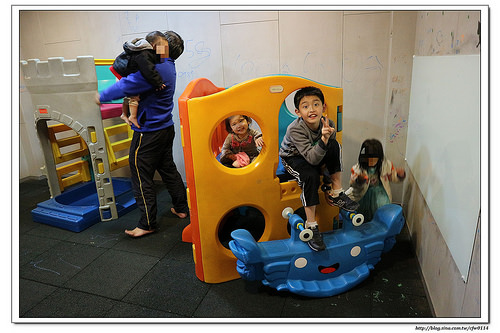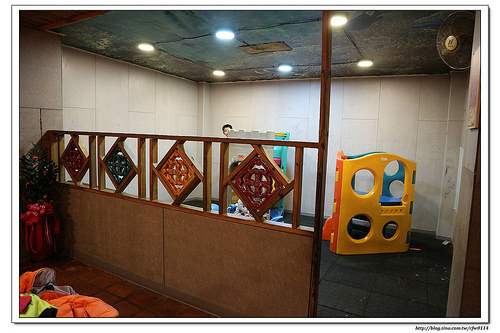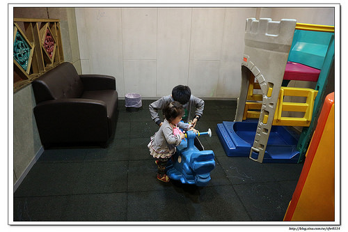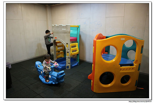 簡單的親子遊樂區擺設了兩三張幼兒遊具以及木馬。