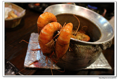 裝在甕裡上桌的招牌胡椒蝦,一上桌就有濃濃的味道,工作人員還特別翻炒了一下。