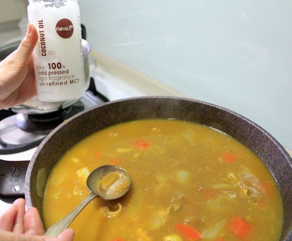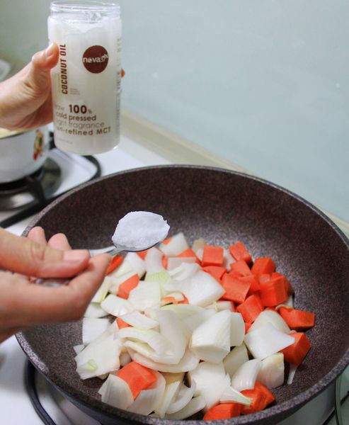 一開始就用椰子油炒紅蘿蔔、洋蔥、咖哩粉跟雞肉,邊炒椰子香就邊上升進入鼻腔了。