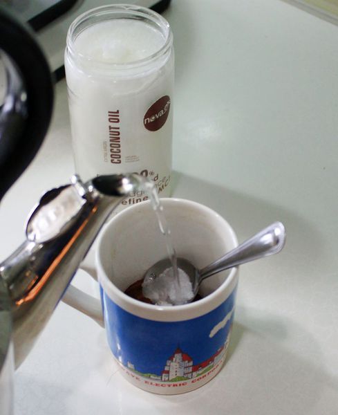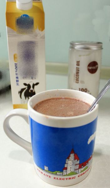 我嘗試加入可可中喝,把可可粉跟一匙椰子油加入杯子裡,沖入熱水再加點鮮奶。