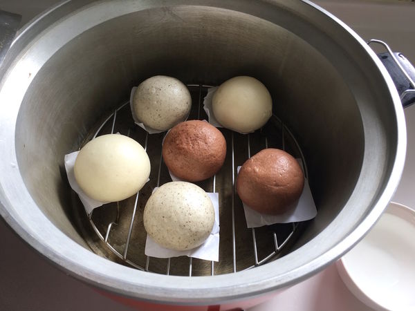 所以蜜汁叉燒包蒸了 17 分鐘後馬上就拿起來要換蒸綜合包子~