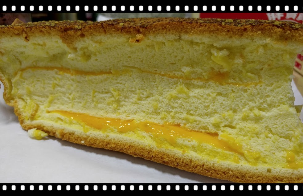 ●口感:外皮作法很特別,沒想到外皮也會這麼豪華大方鋪了滿滿帕瑪森起司粉,還有驚喜出現的乳酪丁!(之前吃過蘆竹一家古早味蛋糕起司口味,外皮作法就沒有這麼澎派。)內餡毫不令色的兩大層整片金黃色濃郁起司,當吃到有夾著起司的蛋糕部分,送入口後,濃郁的起司味道在嘴中蔓延開,好幸福啊!