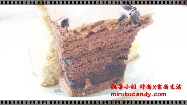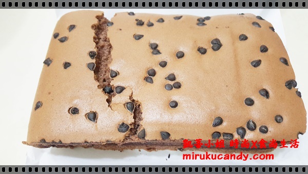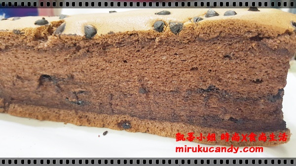 看看這剖面圖,鬆綿綿的蛋糕,裡面還夾著巧克力豆,每一口都有濃郁的巧可力味
