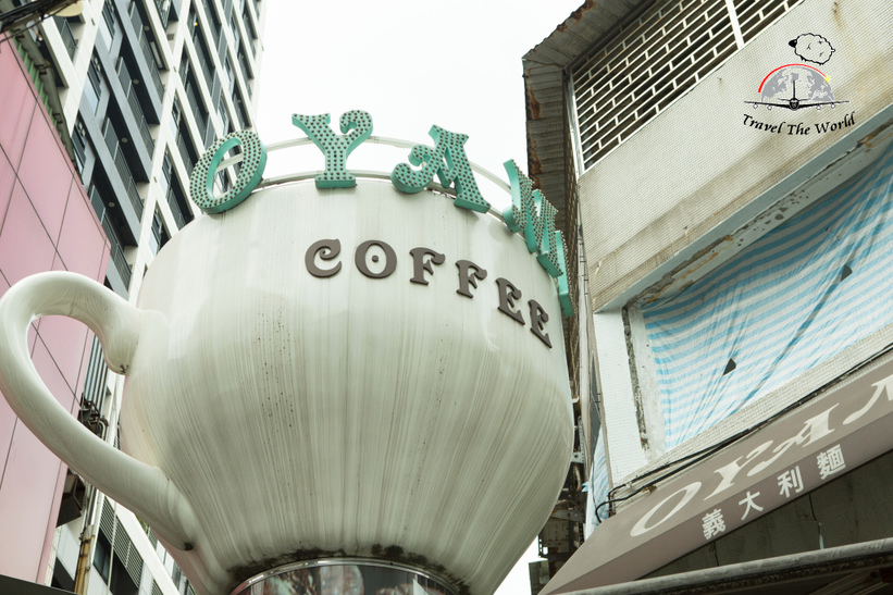 Oyami Caf'e位在宅巷內,抬頭看上二樓處會發現一個大咖啡杯。