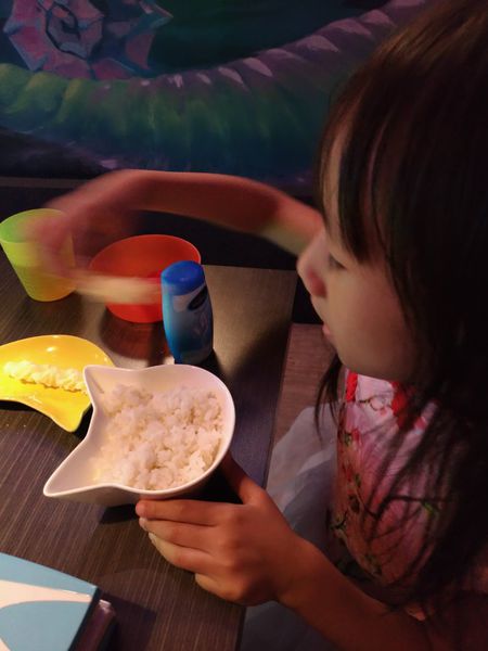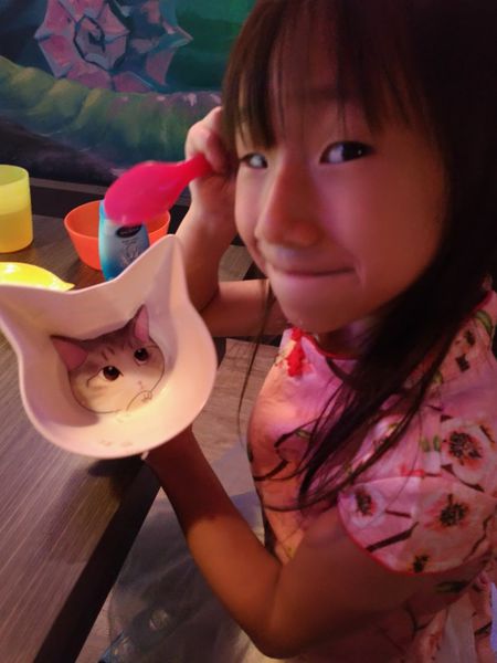 不知不覺阿白將越光香米的 飯吃光光,而喵咪碗底下居然也有個俏皮的貓臉