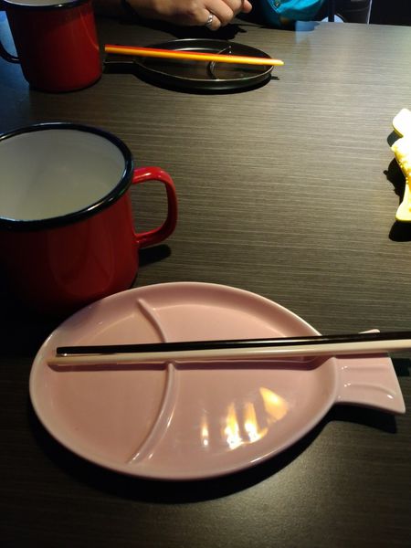 而桌面上已擺好可愛的餐具,讓人印象深刻的是盤子 居然是魚的造型,而大大的鐵杯及不同顏色的 筷子 更顯俏皮