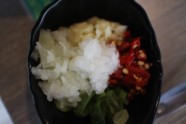 蔥花、辣椒、蒜末、洋蔥、蘿蔔泥、