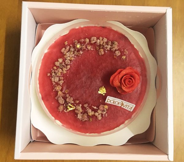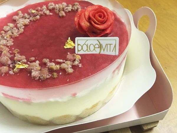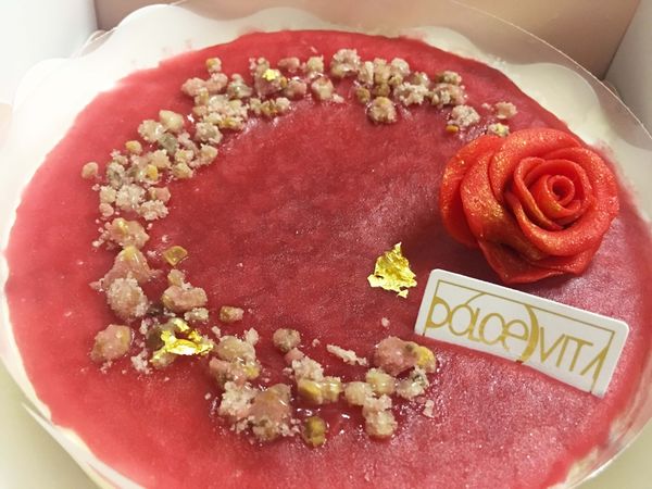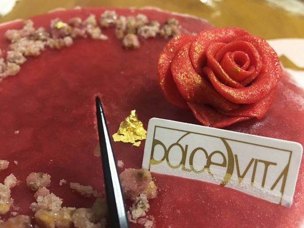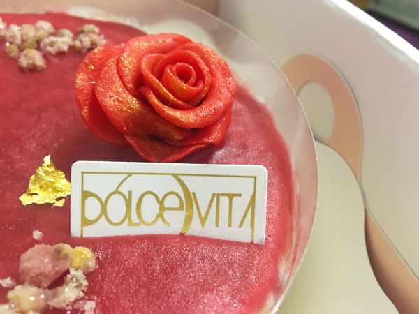 好啦~終於要進入蛋糕秀了,鮮紅色的外觀看了就讓人垂涎三尺,覆盆子的酸甜口感讓蛋糕加分不少,上方的橘紅色玫瑰花居然是巧克力手工製作的,超逼真耶,不會像有些蛋糕店的捏花都不夠精緻,拿來送禮有時都覺得落漆!除了手工花以外,還加上了頂級金箔以及香氣撲鼻的杏仁角,為蛋糕增添了不少華麗夢幻的感覺。