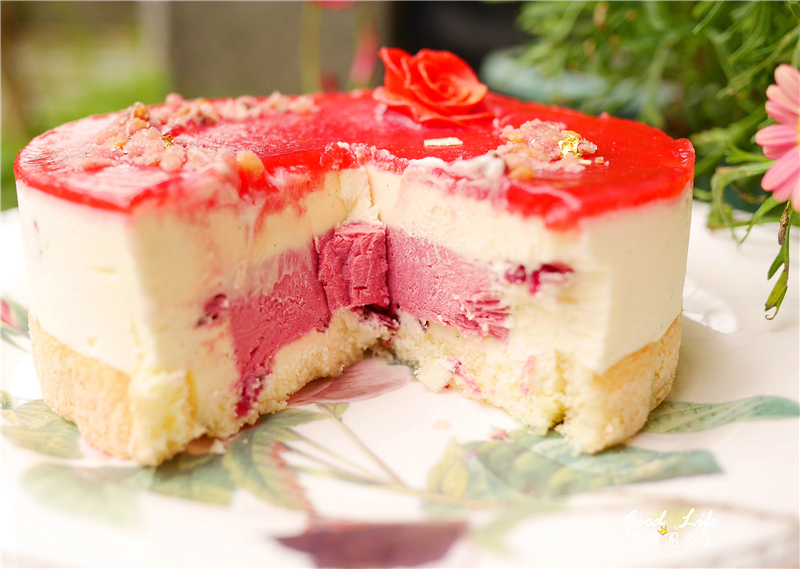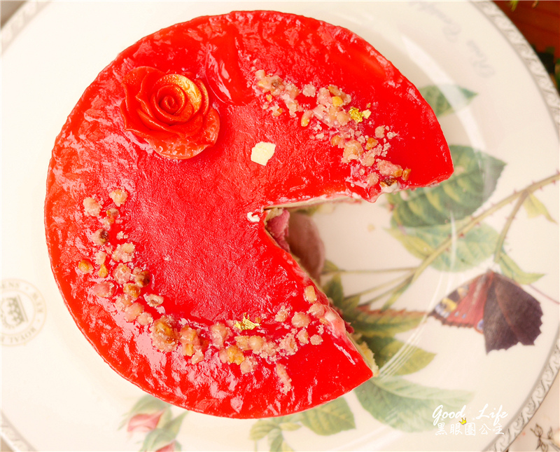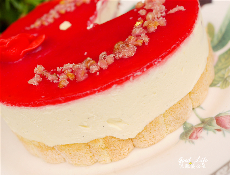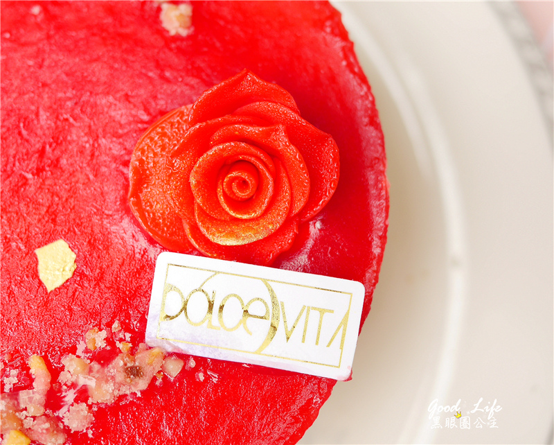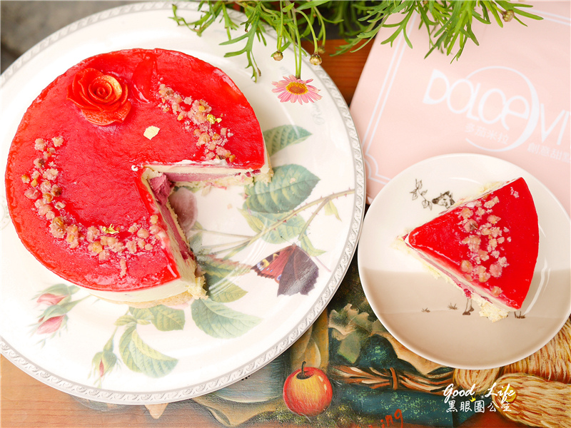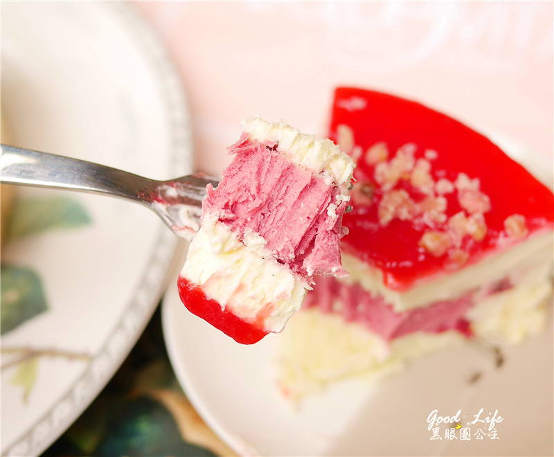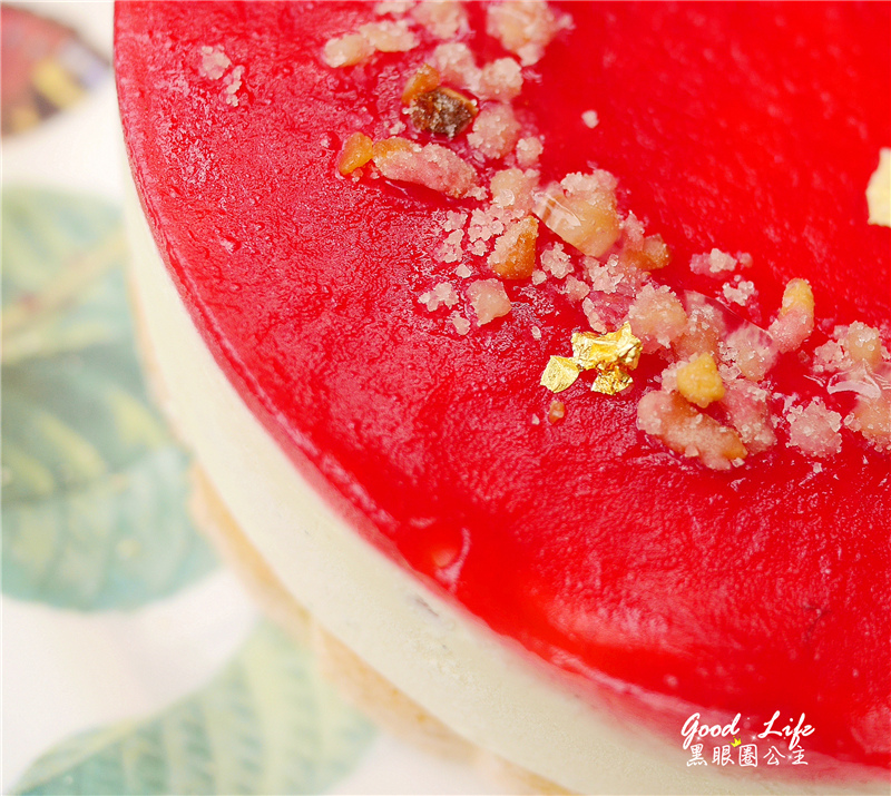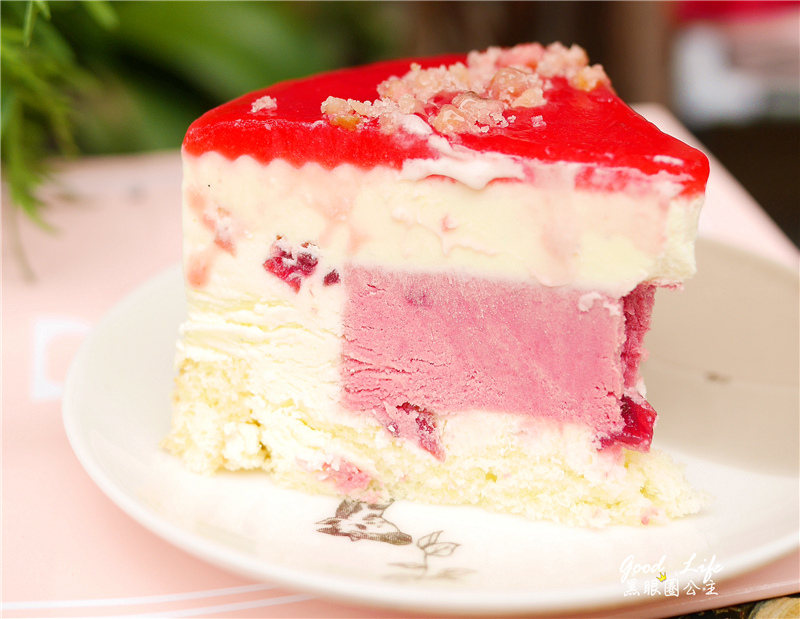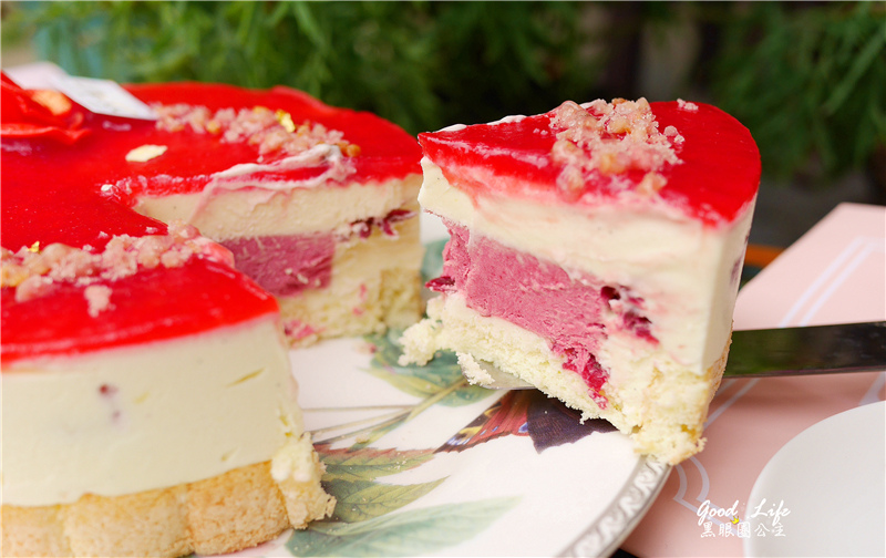 最上面是法國空運的覆盆子淋面加上覆盆子杏仁角…質感的紅色外觀就很優雅…