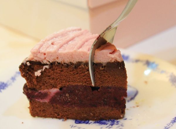 天使芭蕾以巧克力戚風蛋糕為主體,二層巧克力蛋糕中間夾了厚厚厚的藍莓卡士達醬,有1.5CM厚度的夾層,真心不騙,真的很厚。