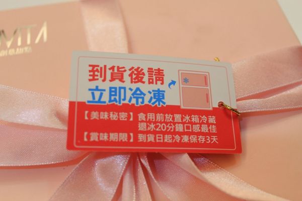 緞帶上的標籤背後有註明保存方式,蛋糕要冷凍唷,也建議在半退冰的狀態下吃口感最好。