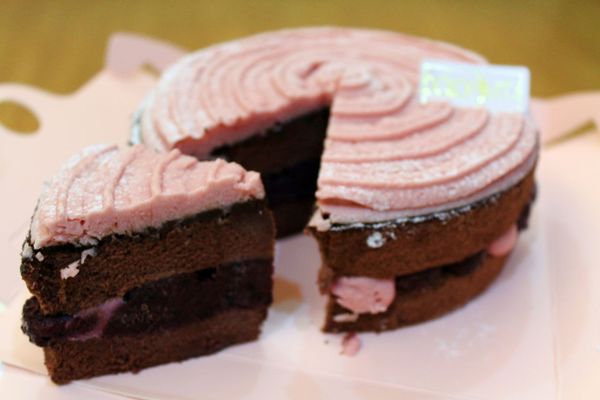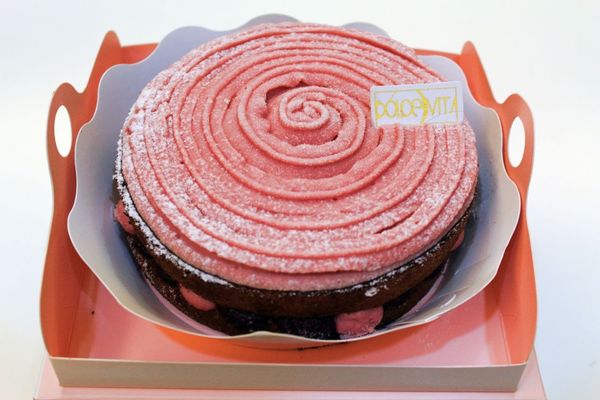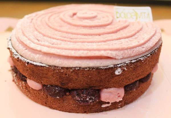 頂層漂亮的粉色螺旋是用法國空運的覆盆莓果自製的慕斯。