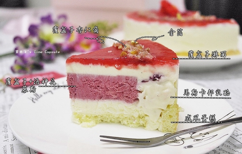 酸甜的覆盆子淋面下是用馬斯卡邦乳酪做的綿細蛋糕主體,