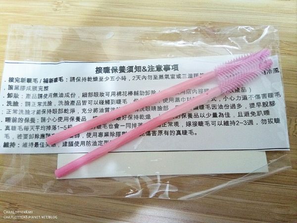 結束後服務人員會詳細的說明後續如何保養並且提供睫毛整理梳,這邊簡單說明一下:有上妝習慣的美人兒記得要將卸妝產品從卸妝油、卸妝乳換成卸妝水,洗臉的時候不要直接潑水,改成用洗臉海綿或洗臉巾,而眼皮周遭用稍微有點洗面乳的泡泡或水帶到沒關係,反而可以將眼皮過多的油脂清理,使嫁接的睫毛壽命更長久。