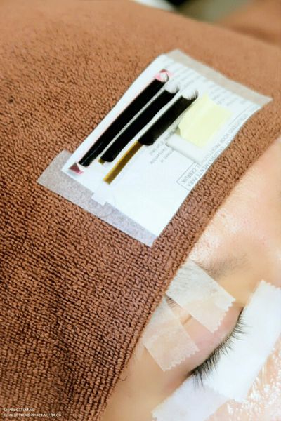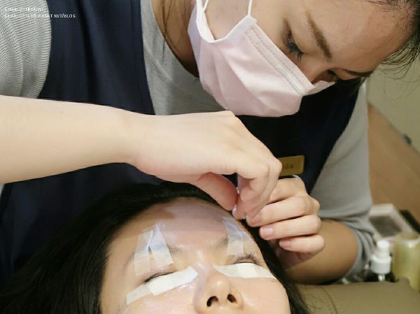 開始之前美睫師Amanda先仔細消毒眼皮以及使用透氣膠帶固定住雙眼的上下眼皮。