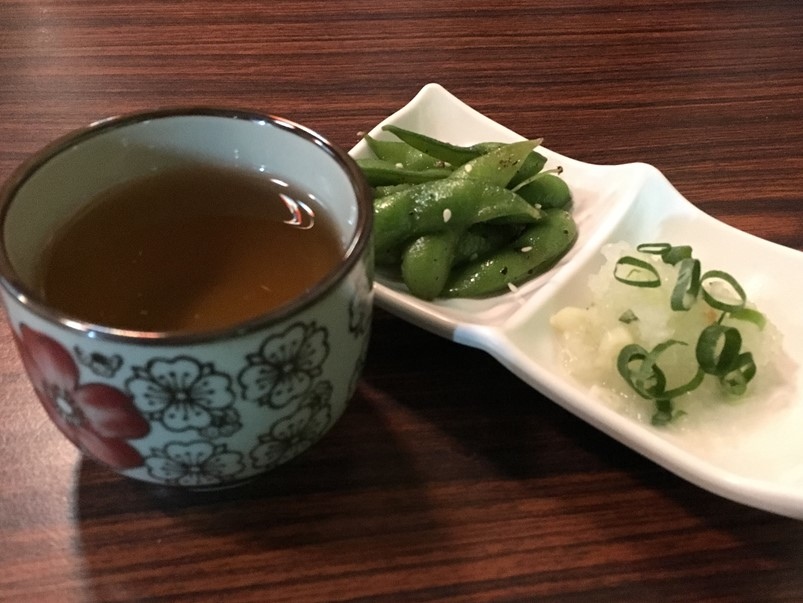 一開始會附上茶水與小菜(毛豆和鹽蔥),鹽蔥的部份是稍後搭配肉類一起吃的,單吃會太鹹,我一開始不知道就吃了XD