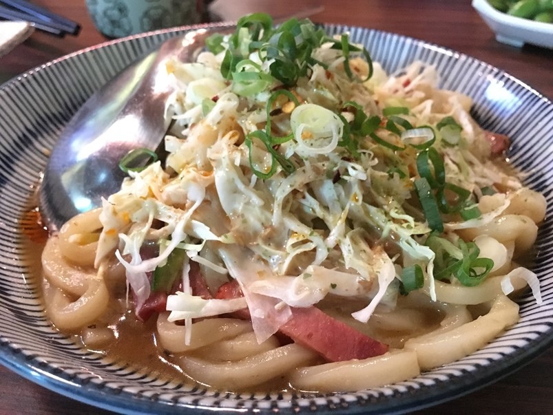 大推!超好吃!胡麻的味道很濃厚,均勻的攪拌烏龍麵、青椒、火腿跟生菜,口感豐富,味道相當有層次,胡麻香氣以及些微的辣感,讓人一口接一口。必點!