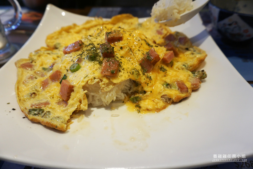 接著我們的主餐來了!是隱藏版的芙蓉午餐肉包飯。吃下第一口的時候,我真的覺得我到了香港,好像就在中環的某間咖啡廳裡面用餐,好久沒有吃到午餐肉了呀!我非常喜歡芙蓉蛋那厚實又微微焦灼的蛋的口感。