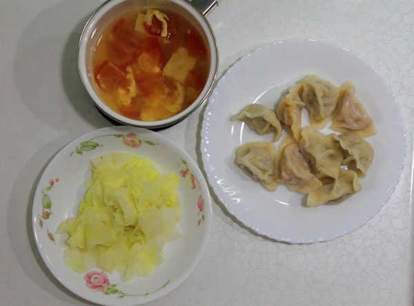 惡魔撒蛋水餃方便又好吃,我還煮了清炒高麗菜及番茄豆腐蛋花湯,簡單料理就是健康美味的一餐。