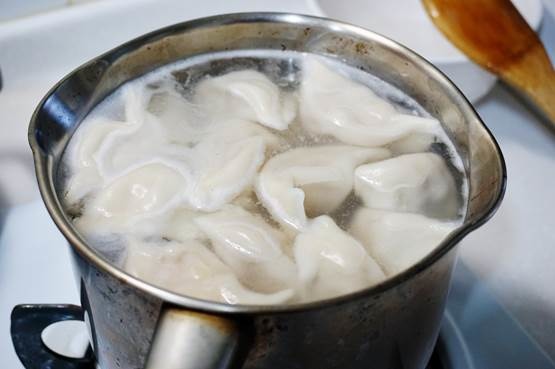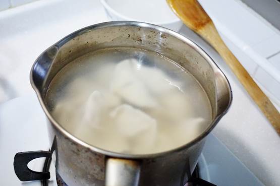 將惡魔撒蛋水餃滾水後關小火放入鍋內,以扁湯匙輕輕攪拌避免沾鍋。