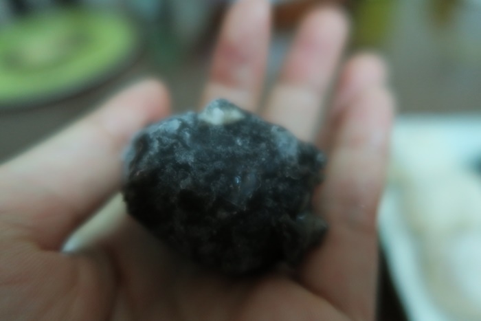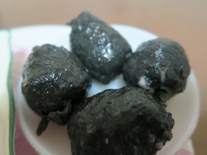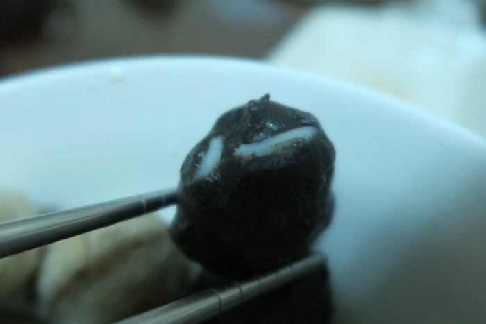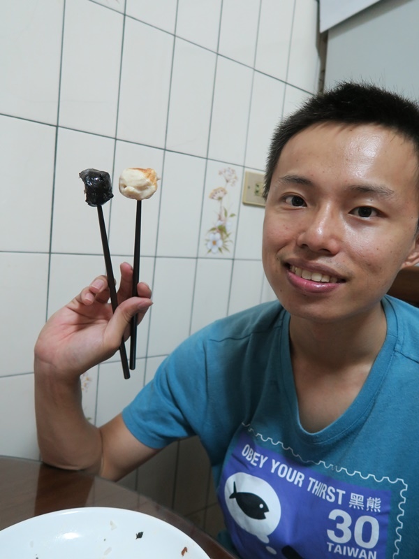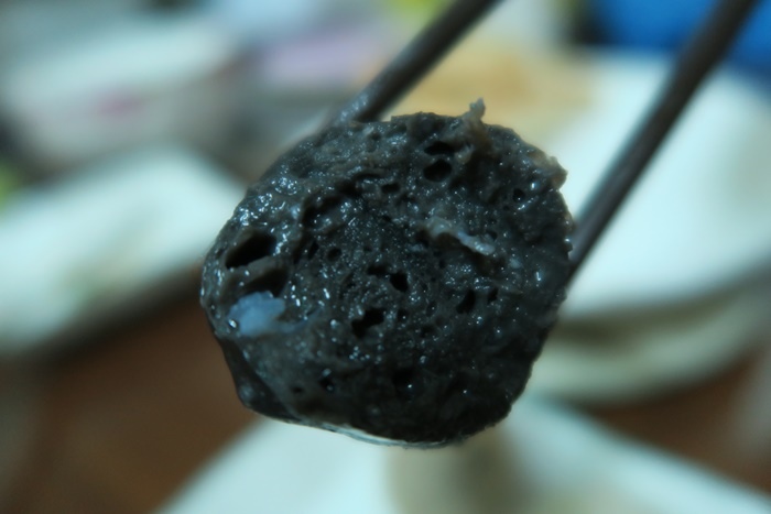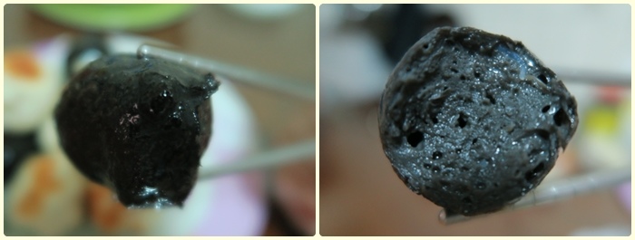 黑到發亮的墨魚丸實在讓人好奇,可以看到一些白色的條狀物,我想那就是花枝吧!!