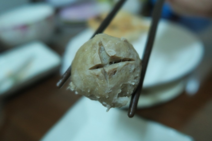先從最喜歡的種類開始吃,在貢丸表面切了個小小的十字,