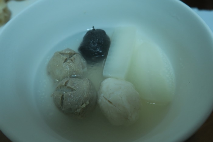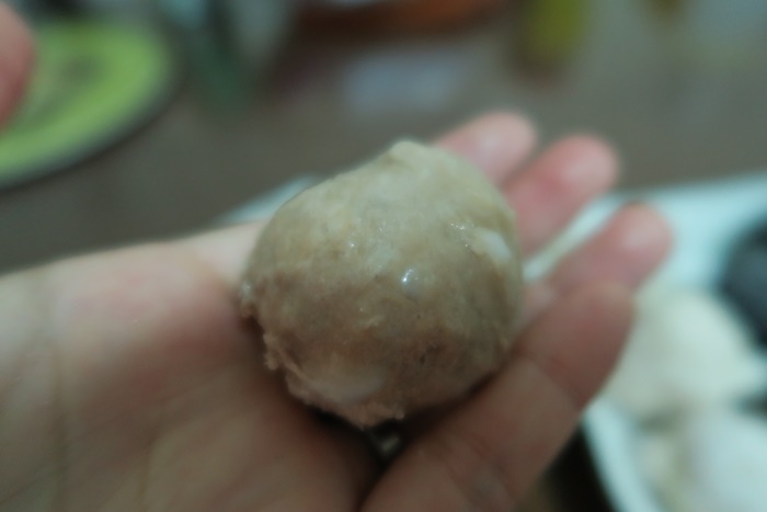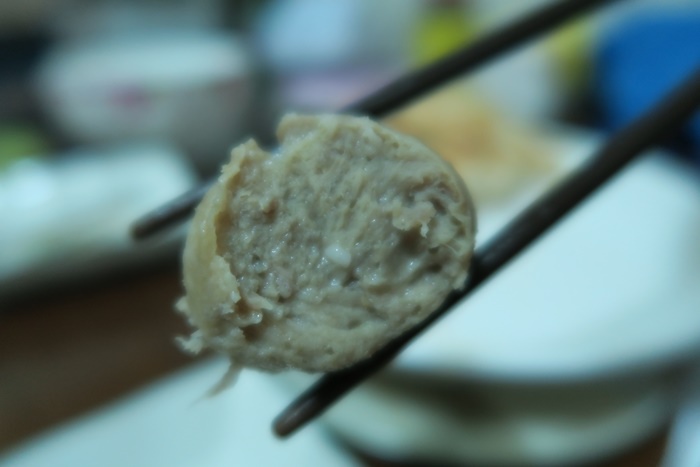 也可能跟煮沒很久有差,這時候肉汁都還鎖在貢丸裡,還沒進到湯裡,