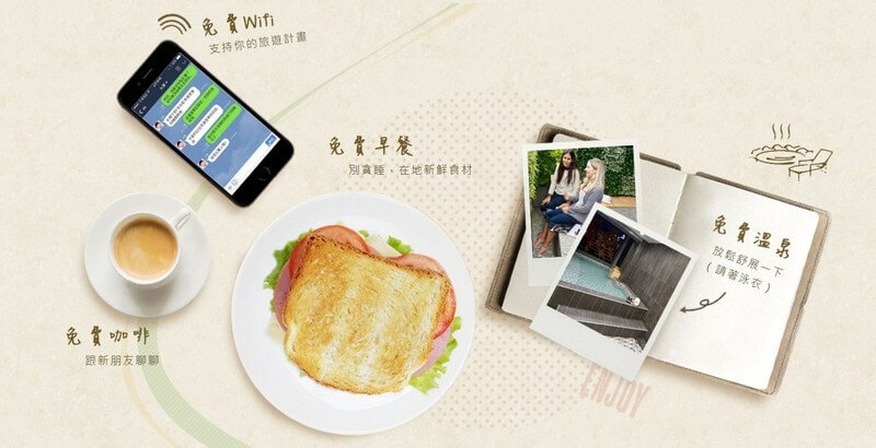 可以來個人小旅行、安排與好友群們一起體驗背包客生活,還有機會一同與外國人泡湯交朋友!