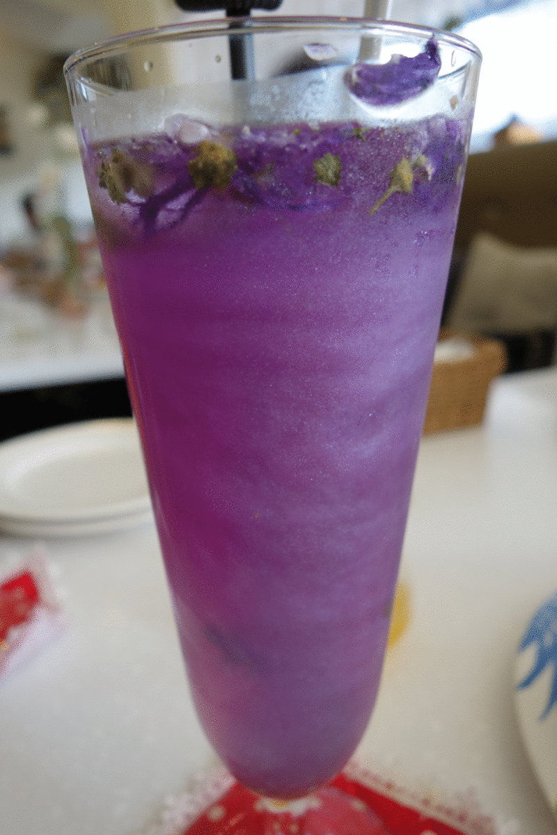 這杯飲料超酷的,紫色應該是蝶豆花跟其他東西,加了枊橙汁會產生神奇的變化喔
