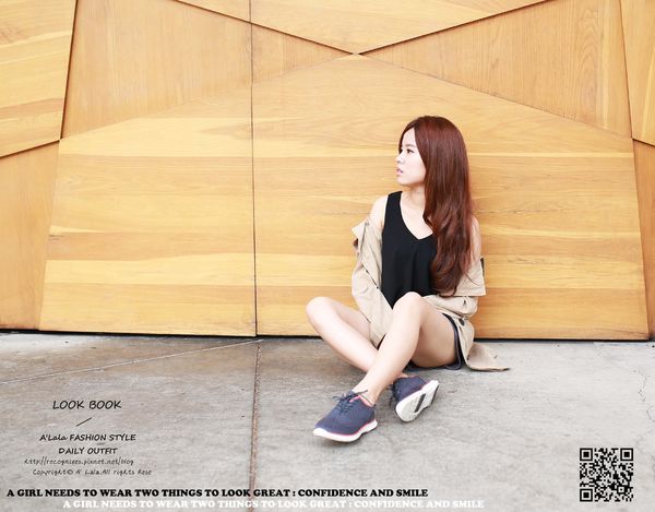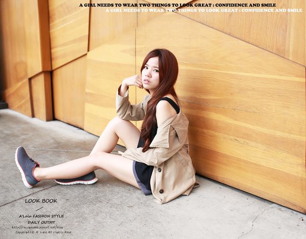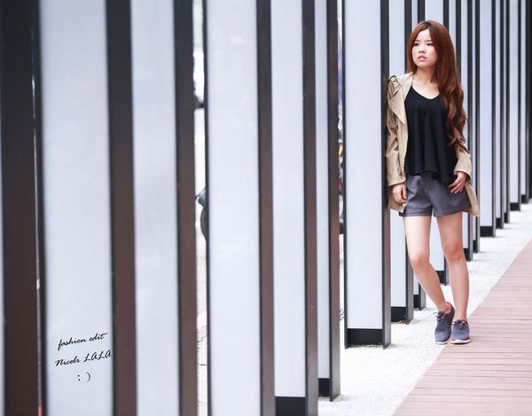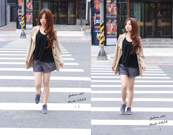 LOOK 1>> 黑色雪紡背心+西裝短褲+米色風衣