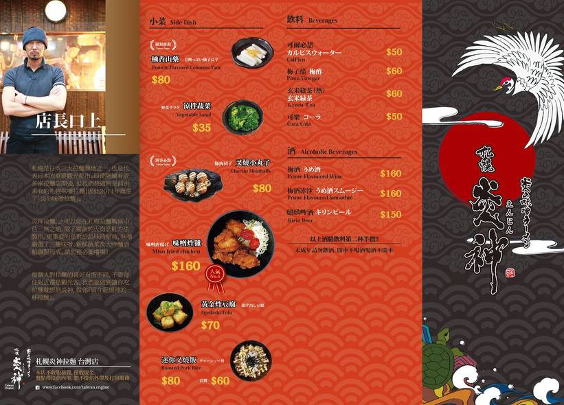 還有榮獲日本2012沾麵大賽,北海道唯一指定代表「炎の味噌·白麻婆つけ麺」與北海道最好吃的鹽味拉麵「海薰炎の潮拉麵」,滑順濃厚的口感,吃了就令人難以忘懷這獨特的美味,炸雞也好吃到讓人意猶未盡呢!!