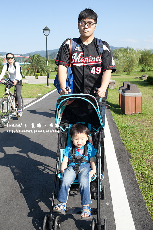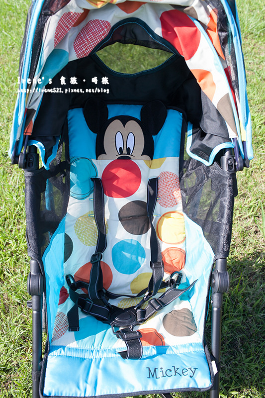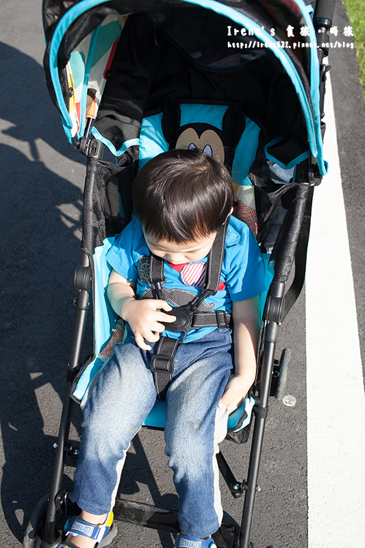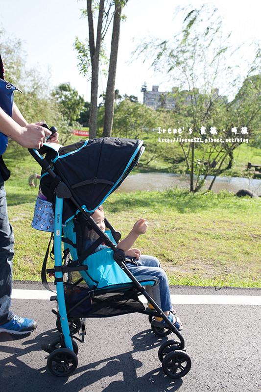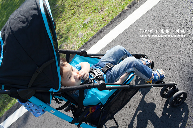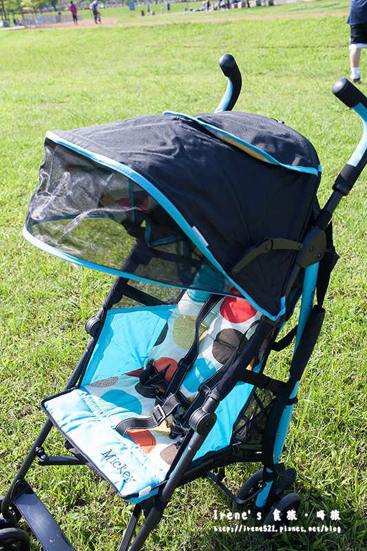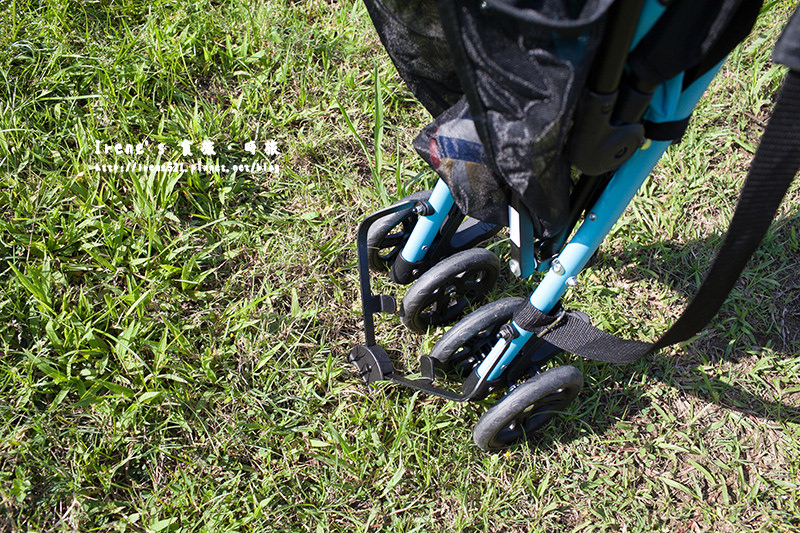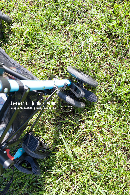 輕便傘車推起來很穩不會過度搖晃,有一點高低差還蠻順利就通過,難推的草地也推的很順,