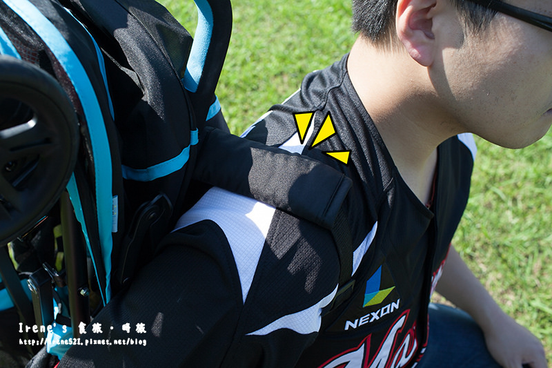 雖然推車僅5.5kg,但揹帶上還有減壓設計,減輕父母的肩膀負擔,