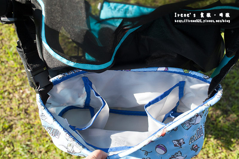 推車底下的置物籃空間不小,但如果還是雜物很多不敷使用,可以加購「迪士尼米奇塗鴉推車置物袋」,