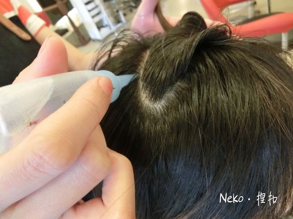 一開始助理先上染前的頭皮隔離,細心塗滿而且按摩整個頭皮,