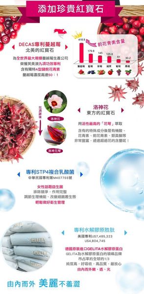 專利蔓越莓、STP4 乳酸菌、專利膠原蛋白、β-胡蘿蔔素、Vit C、洛神花、奧勒岡、綠茶