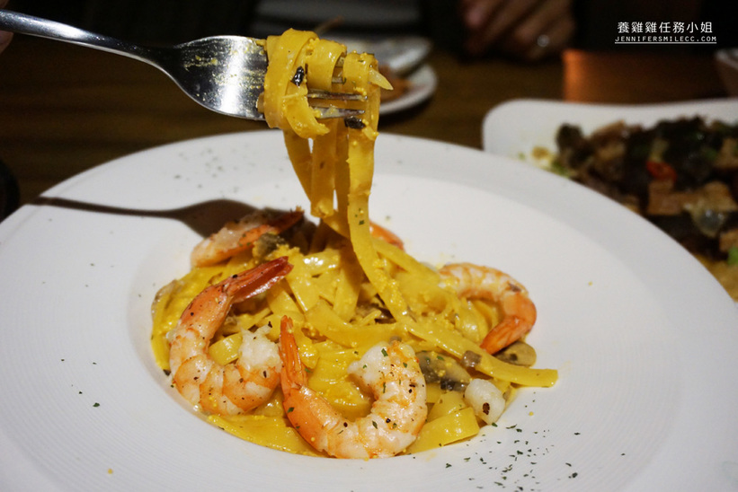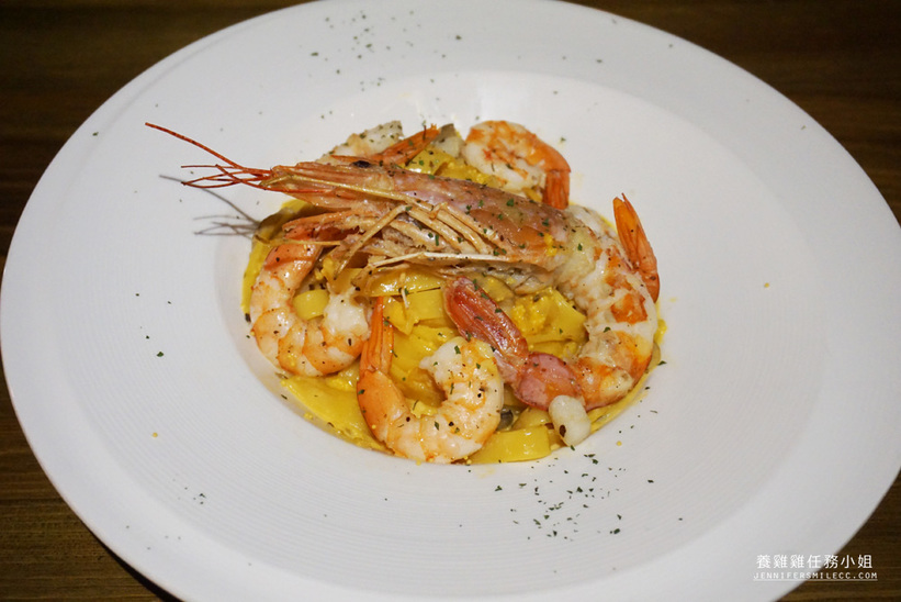 朋友點了另外一個主食是魚卵海膽奶油鮮蝦義寬扁麵,別看這道好像沒有剛剛燉飯的海鮮那麼彭湃,這道魚卵海膽奶油鮮蝦義寬扁麵可是把海膽和魚卵完美的融合在寬扁麵裡面。一口把捲上來的寬扁麵吃進嘴裡,魚卵會巴茲巴茲的繃開在嘴裡,旁邊的蝦子大概有個五尾,每尾都很鮮甜,這道寬扁麵我和朋友都滿喜歡的。