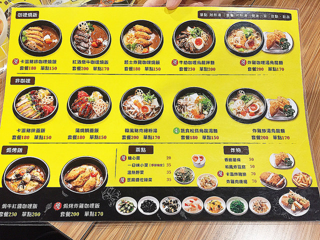 咖哩燒飯五種,非咖哩五種,焗烤飯兩種,單點的茶點和炸物