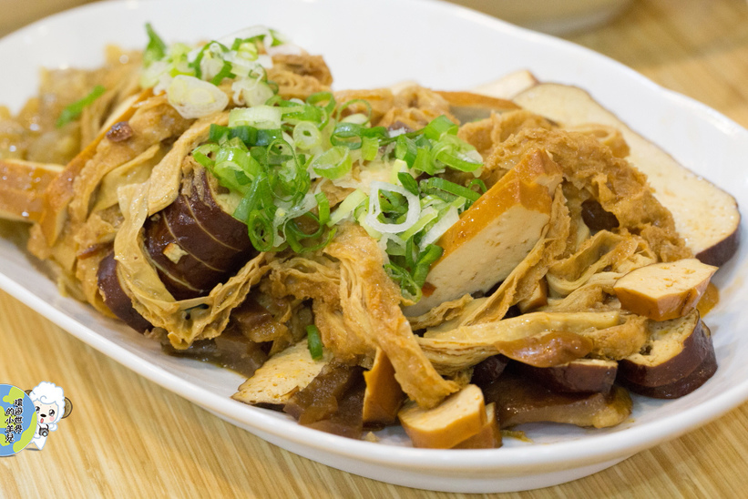 雞蛋、洋蔥、香菇、番茄、絞肉拌炒,再加入特製醬汁而成,