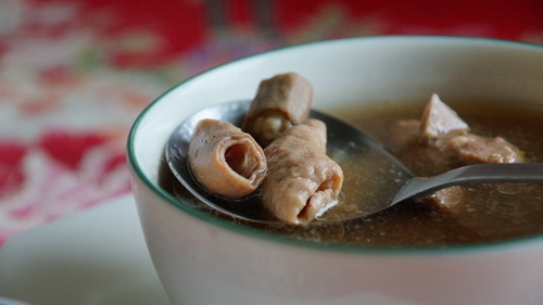 湯裡面有兩塊排骨,幾段豬小腸,排骨是吃得到肉的,不是裝飾用的,而且肉質不乾澀,豬小腸很軟嫩,連老人家都能輕鬆入口(因為我在喝肉骨茶的時候,我媽偷吃了一段豬小腸)。