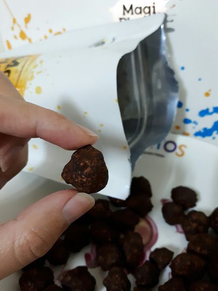 爆米花外層裹著太妃糖,味道很像偉特奶油糖,加上微苦的巧克力粉就不會覺得過甜
