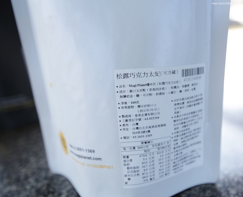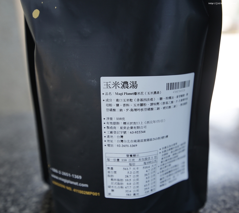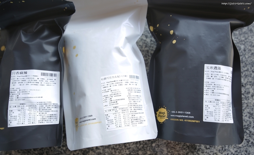 這次一共收到6包三種口味,分別是 川香麻辣 松露巧克力太妃 玉米濃湯,包裝後面都有詳細成份與重量。