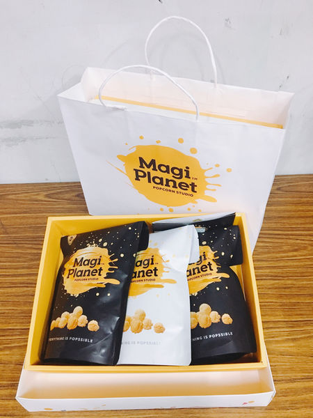 Magi Planet 星球工坊的爆米花包裝,有別於以往桶裝,他們還有禮盒的包裝,禮盒設計用色鮮明,讓人感覺很有朝氣有活力,質感超好,還附上精美的包裝袋,拿來當伴手禮真的超大方