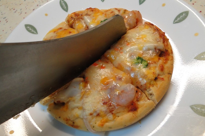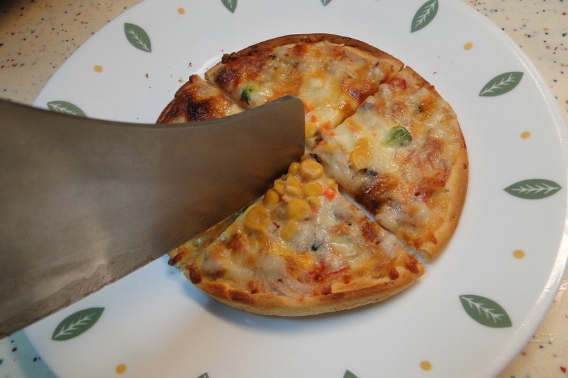 拿用來切肉的大菜刀切披薩,順著刀本身的重量壓下去,直到聽到切斷餅皮的聲音就可以順利切開。