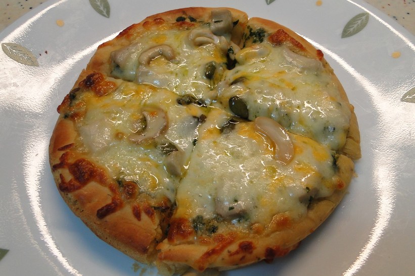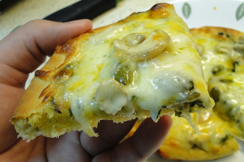同樣是將杏包菇切片藏在起司裡,這批薩一拿出來就可以聞的到九層塔的香氣,讓一向不怎麼吃披薩卻超愛九層塔的膩膩一整個食指大動哈哈哈!