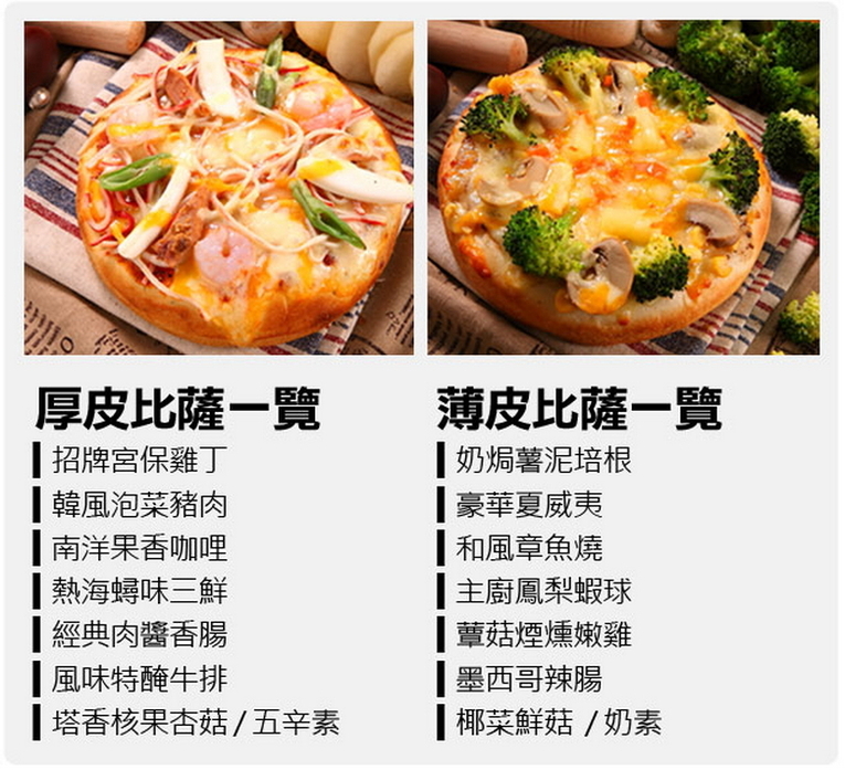 瑪莉屋口袋披薩目前提供了14種口味可以選擇,包含了厚皮與薄片口味各7種,其中厚皮與薄皮各包含了一種素食口味,這次賽肥我選了9種口味,分別是5片厚皮4片薄皮,口味如下 -