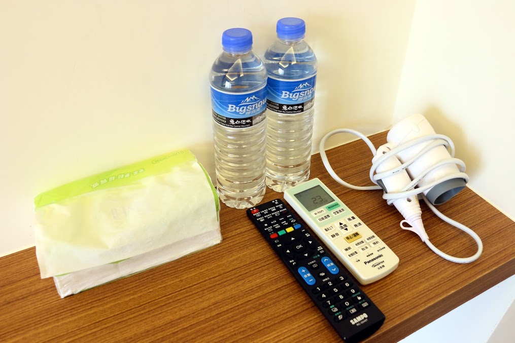 房間有電視、冷氣遙控器、吹風機、礦泉水、衛生紙~