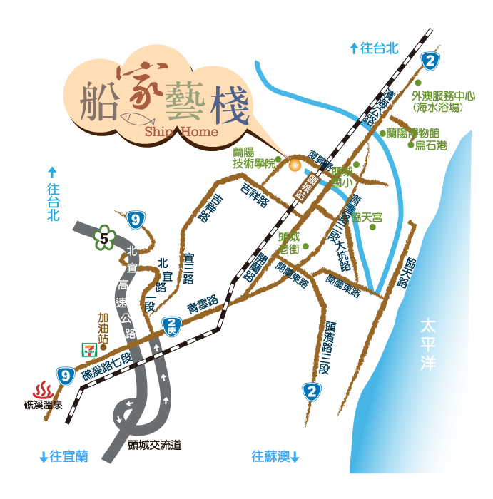 花蓮 → 蘇澳(台二省道,濱海公路) → 左轉開蘭東路 → 右轉開蘭路 → 左轉吉祥路 → 右轉復興路 → 船家藝棧