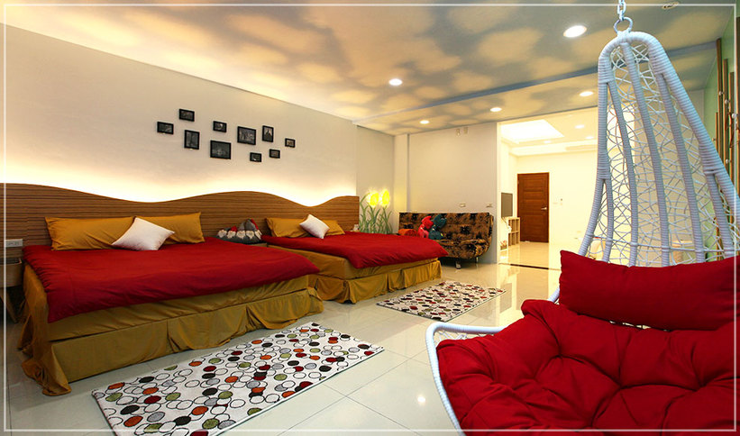 連牆壁上的夜燈都是瓢蟲造型,還有吊椅,可以在這裡享受舒服的渡假時光啊~