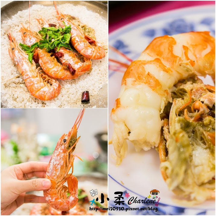 新鮮的天使蝦,放在粗鹽上加熱烹煮